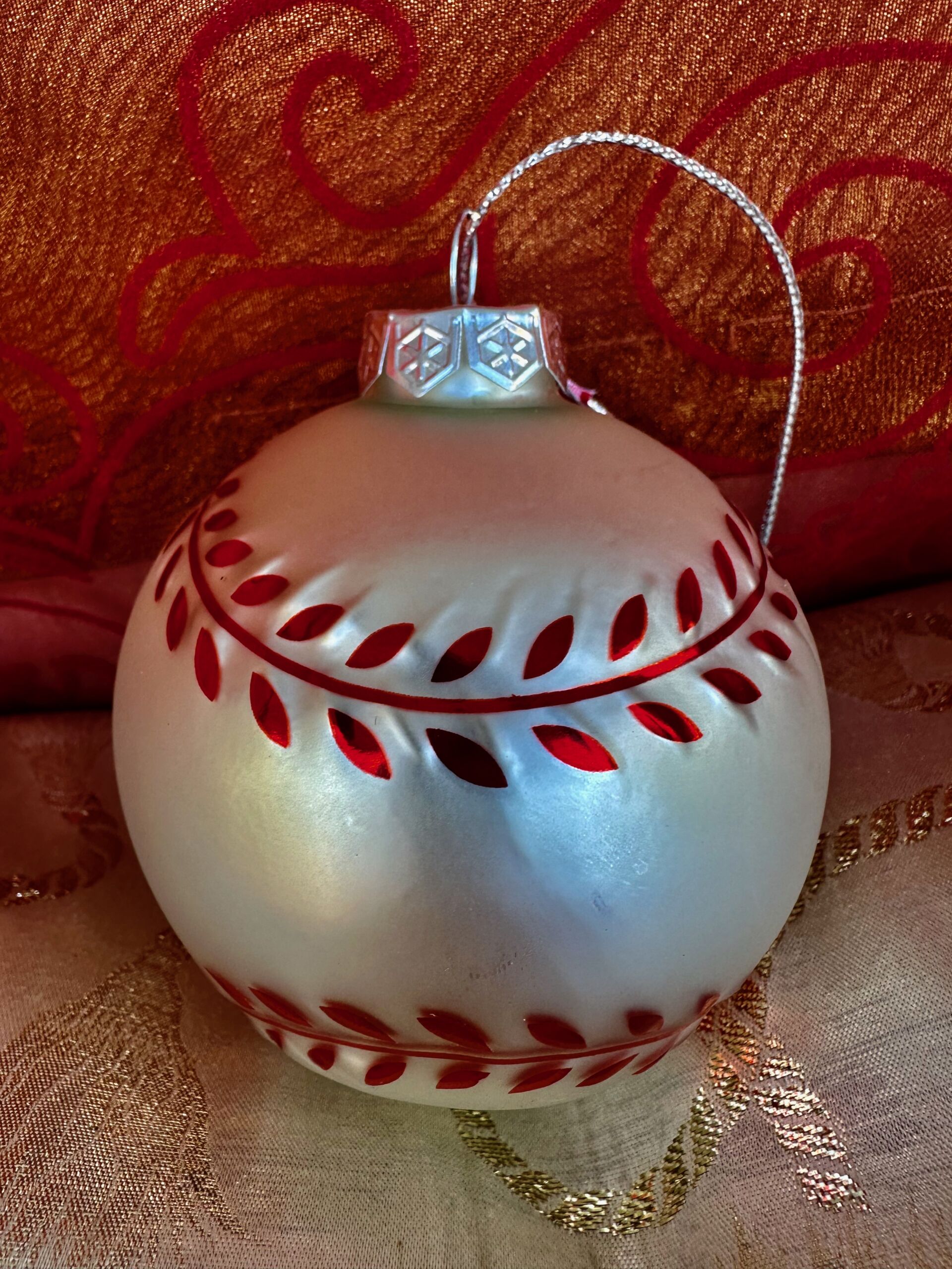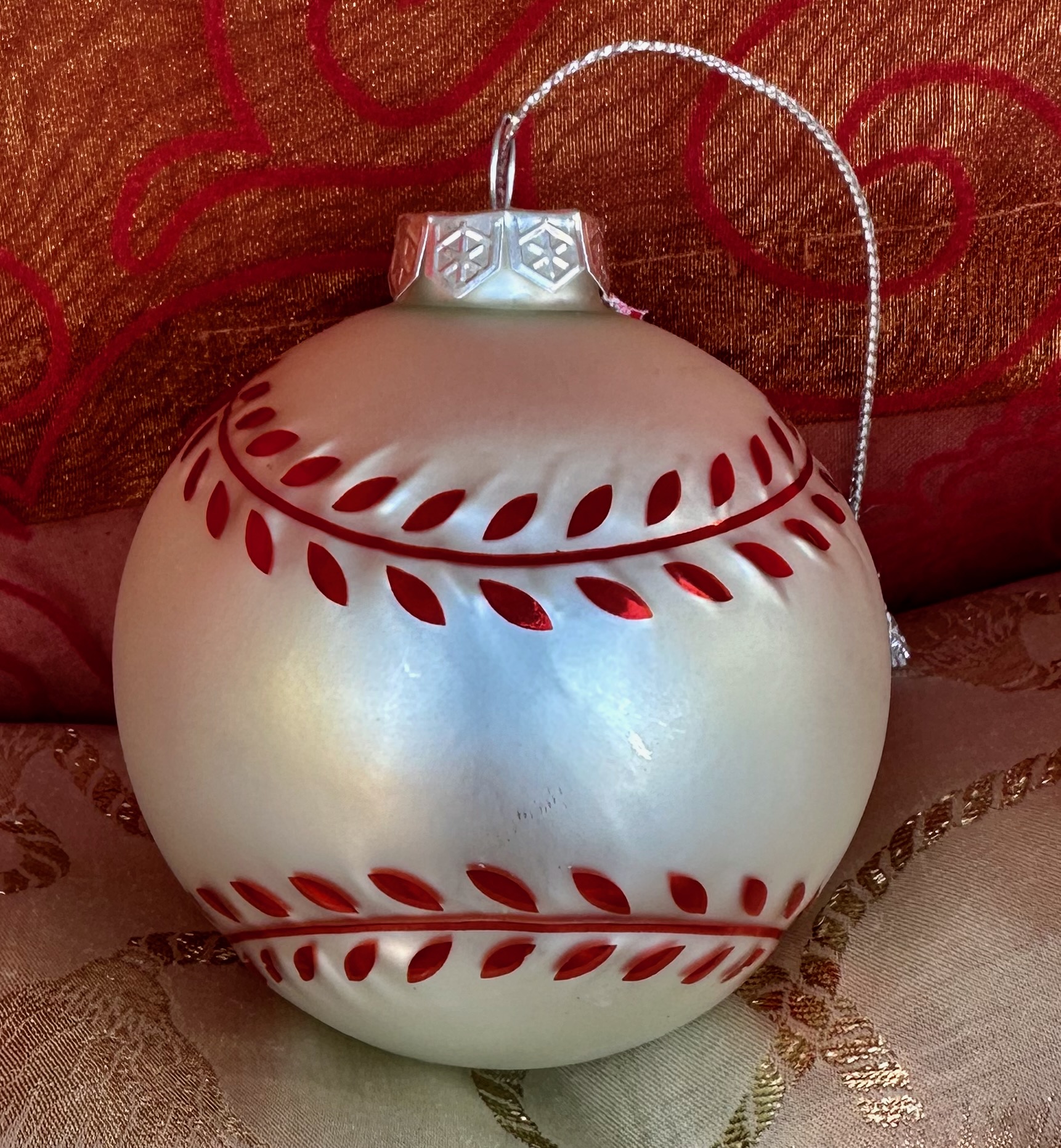 Beautiful baseball ornament. Satin sheen. Light and lovely. 3″ diameter.
