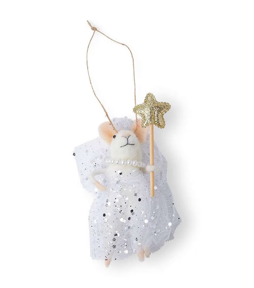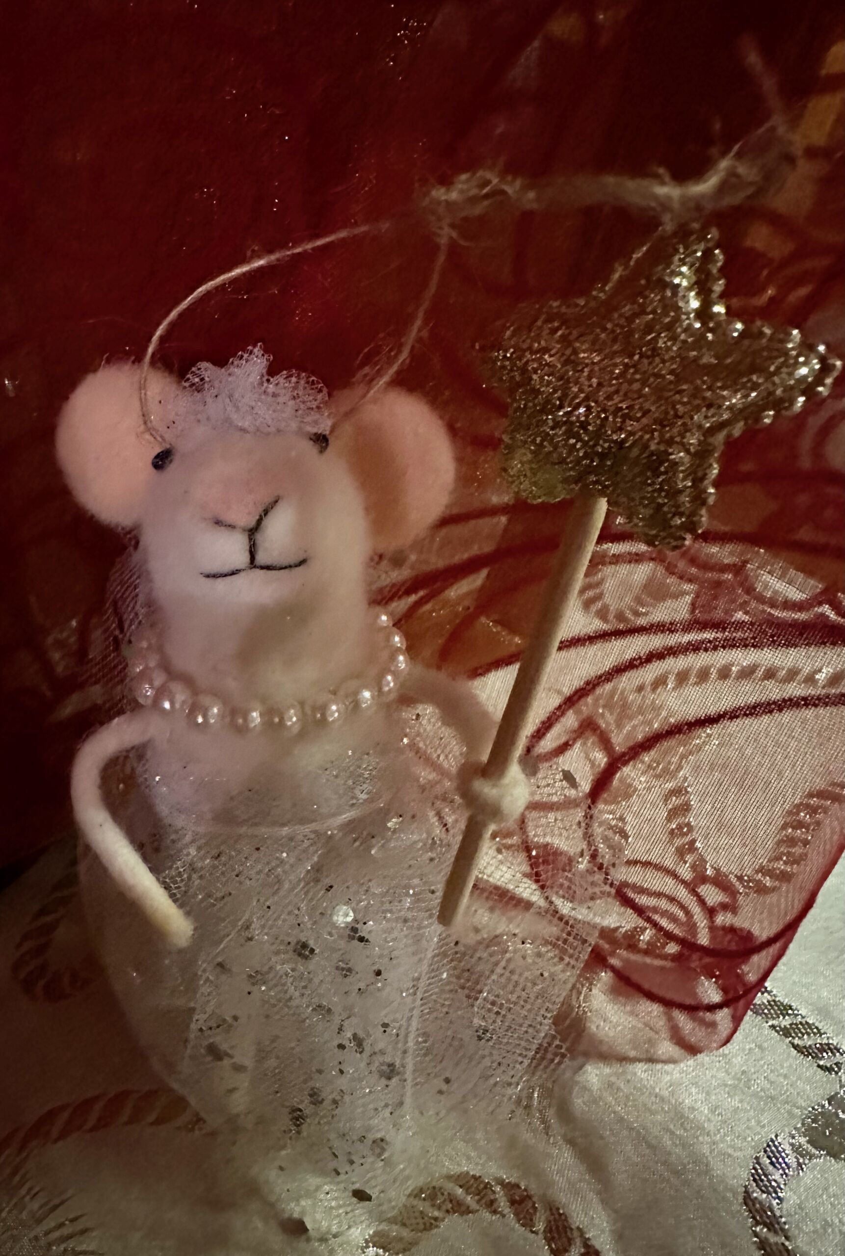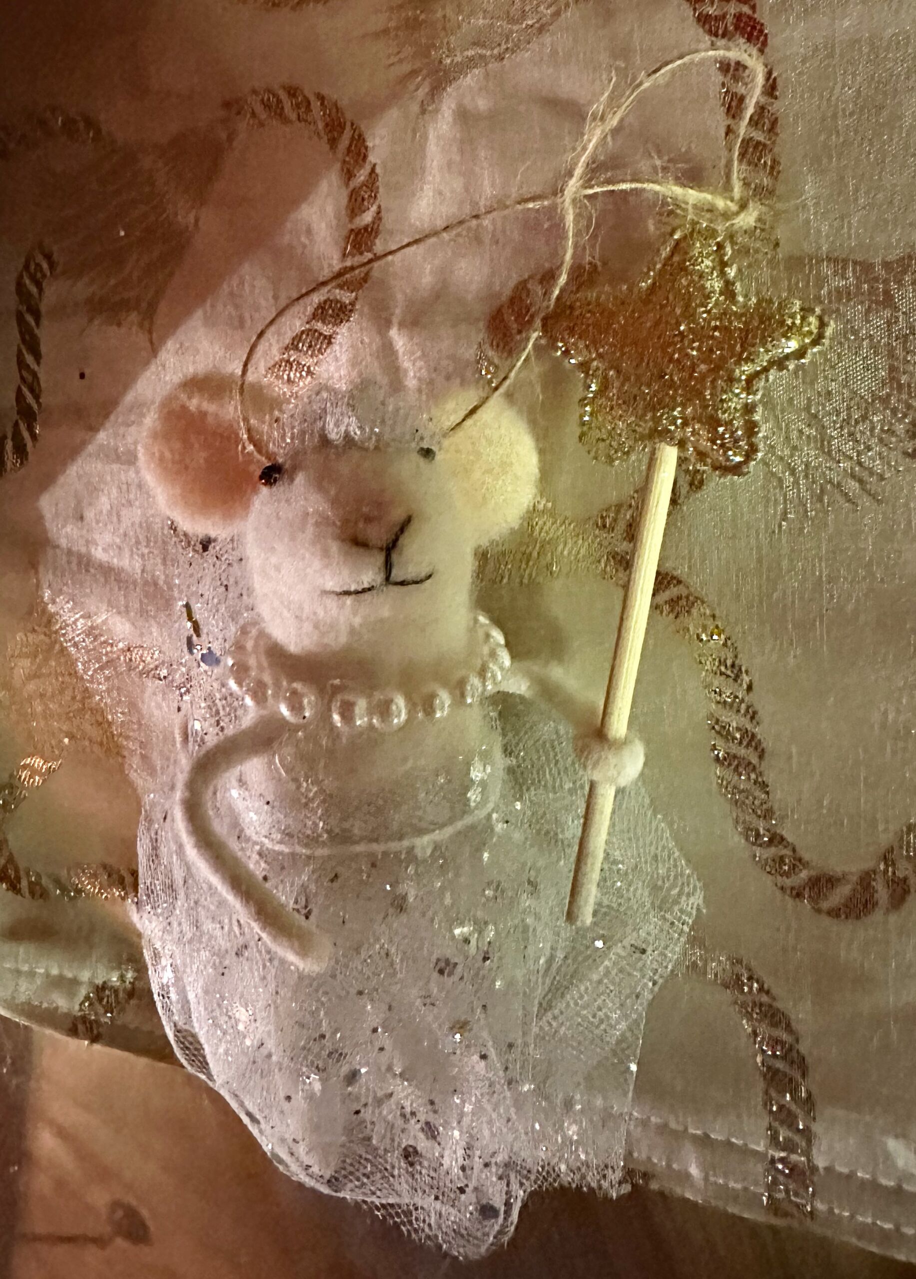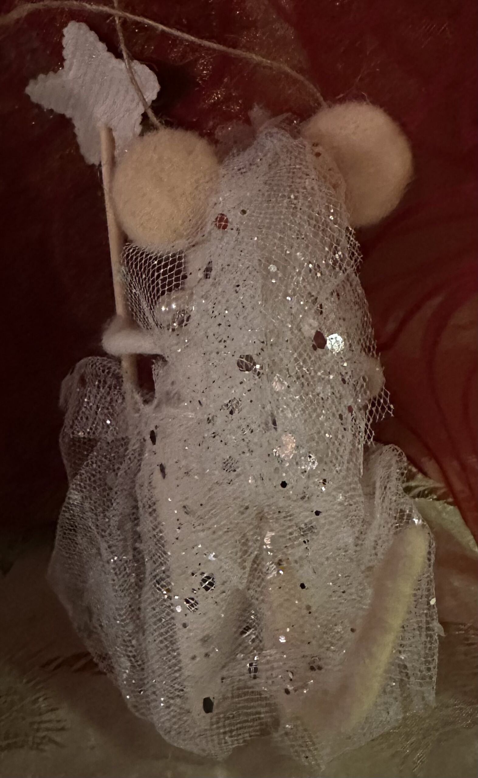 A little fairy princess mouse in her sparkly voile dress with matching veil, pearl necklace, shimmering star wand, and little pink ears and nose. 5″ tall. Her 3″ tail is behind her.