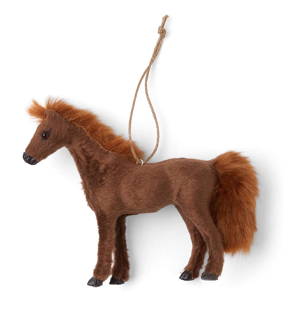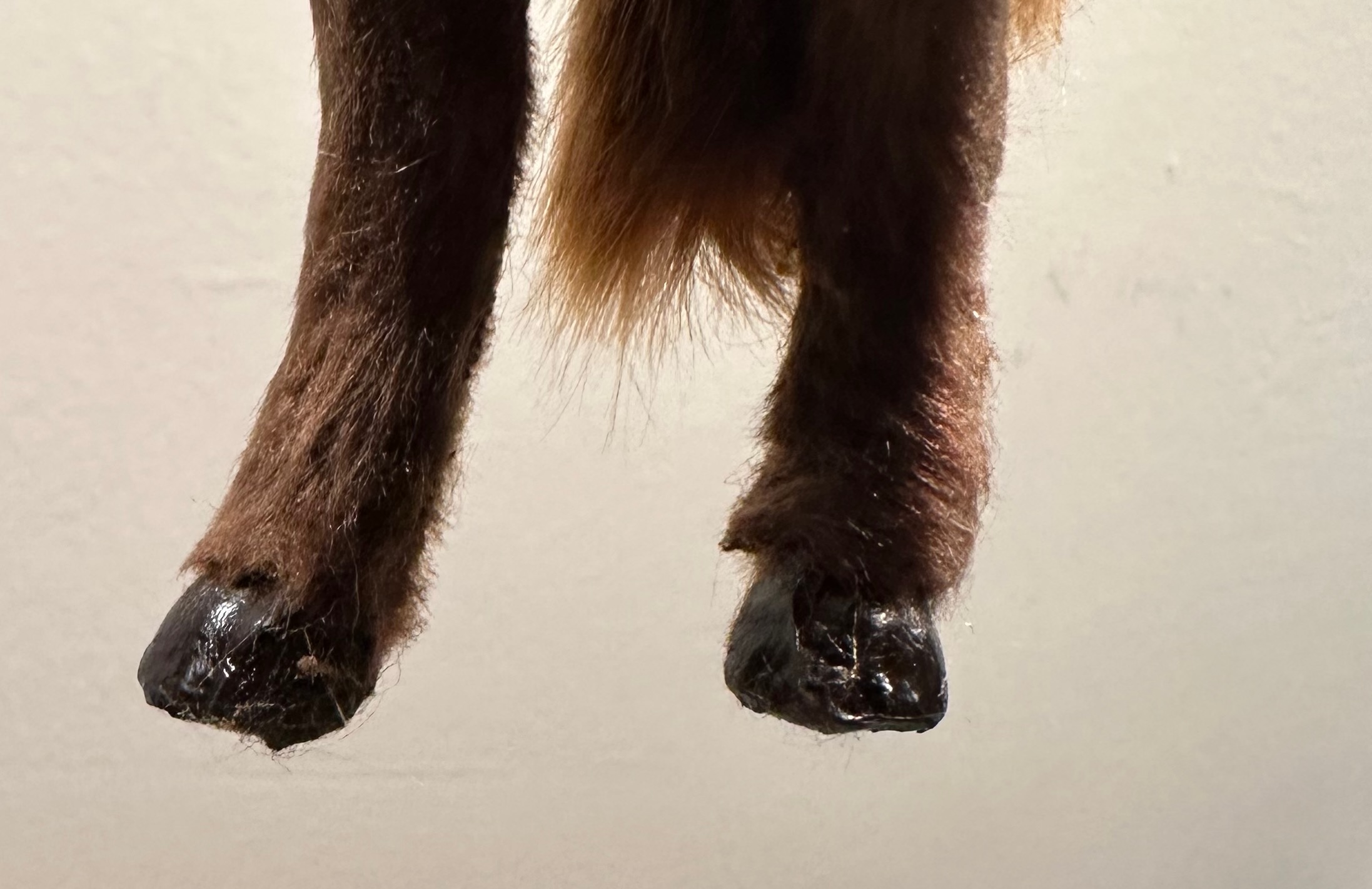 A gorgeous furry horse with majestic mane and tail, and a white blaze down a beautiful nose. Amber eyes and detailed nose and hooves. Almost 5″ tall by 5.5″ nose to tail.