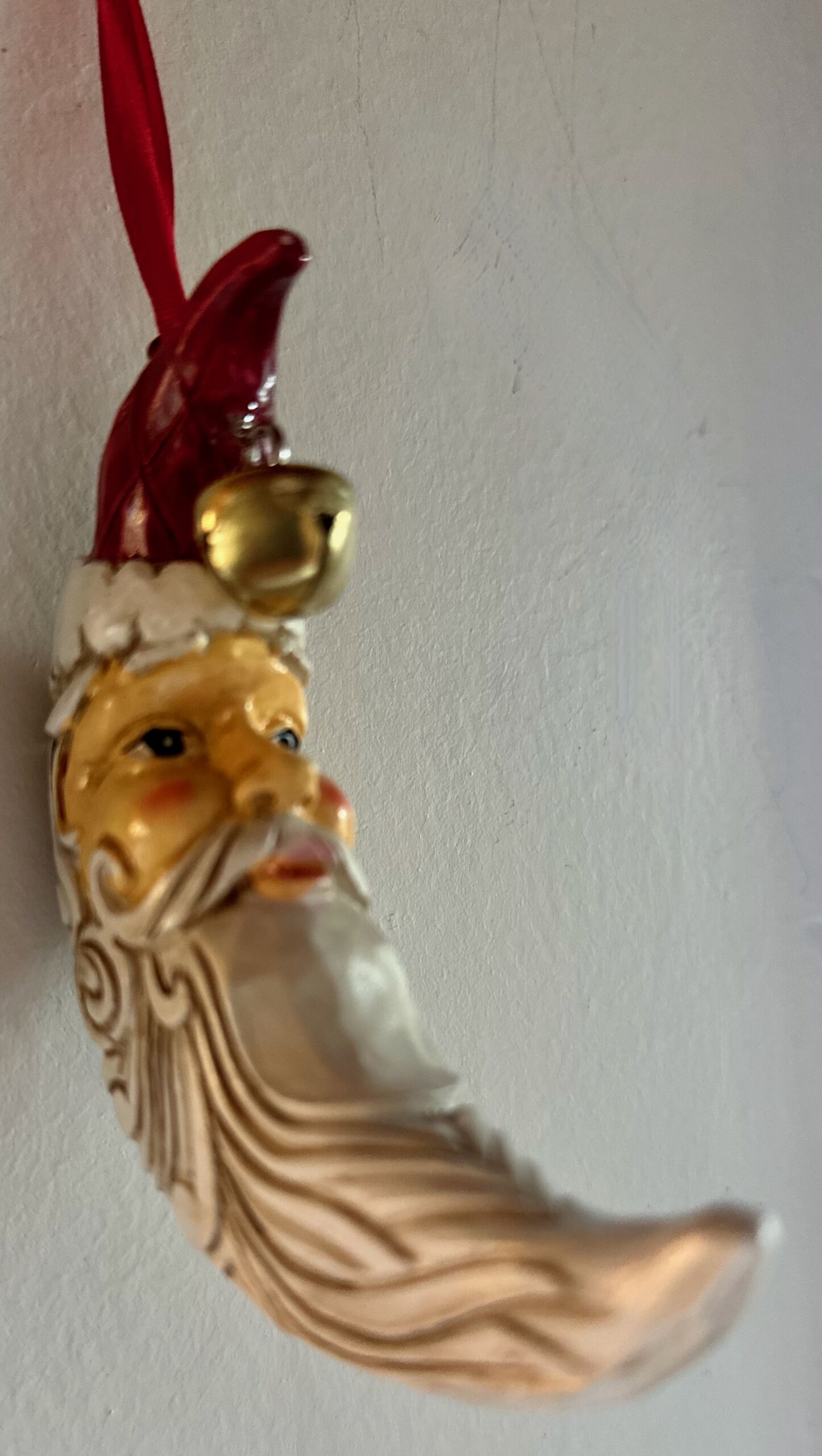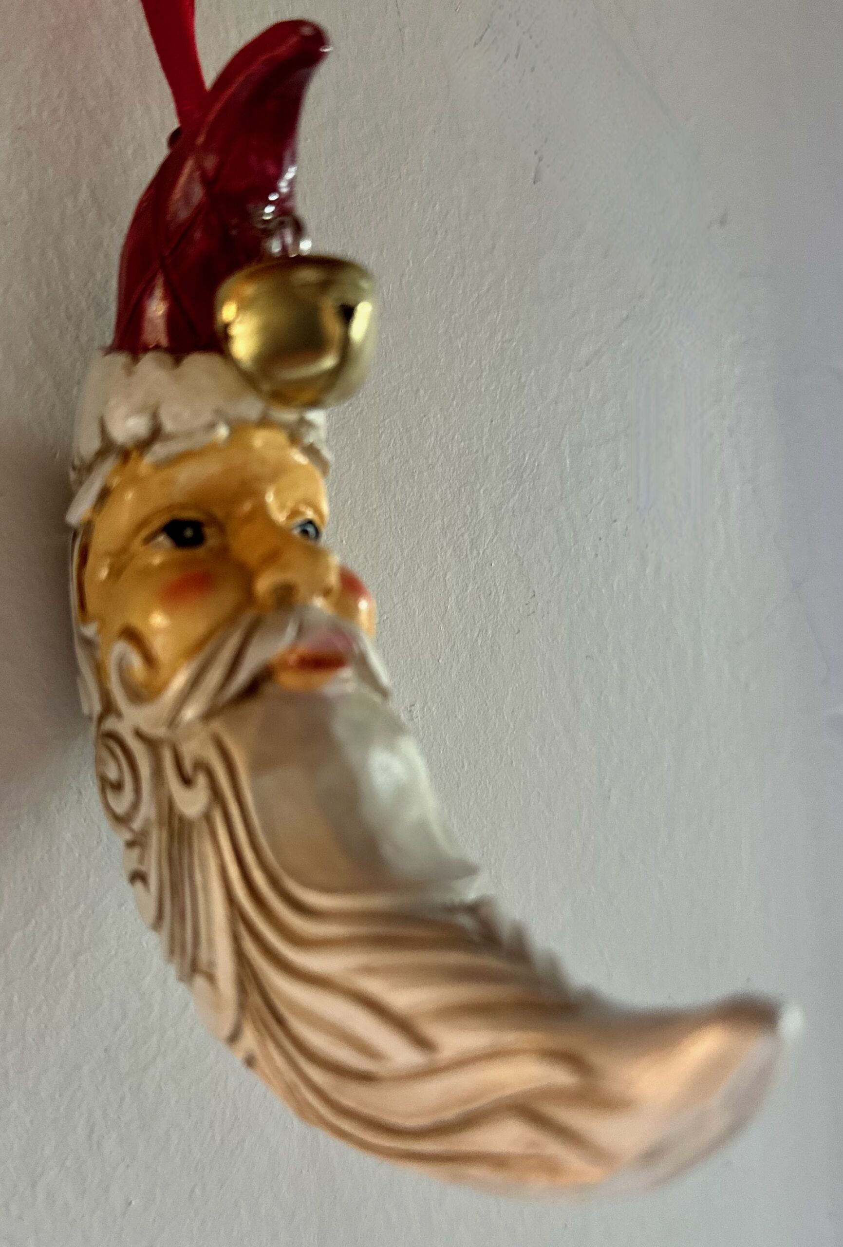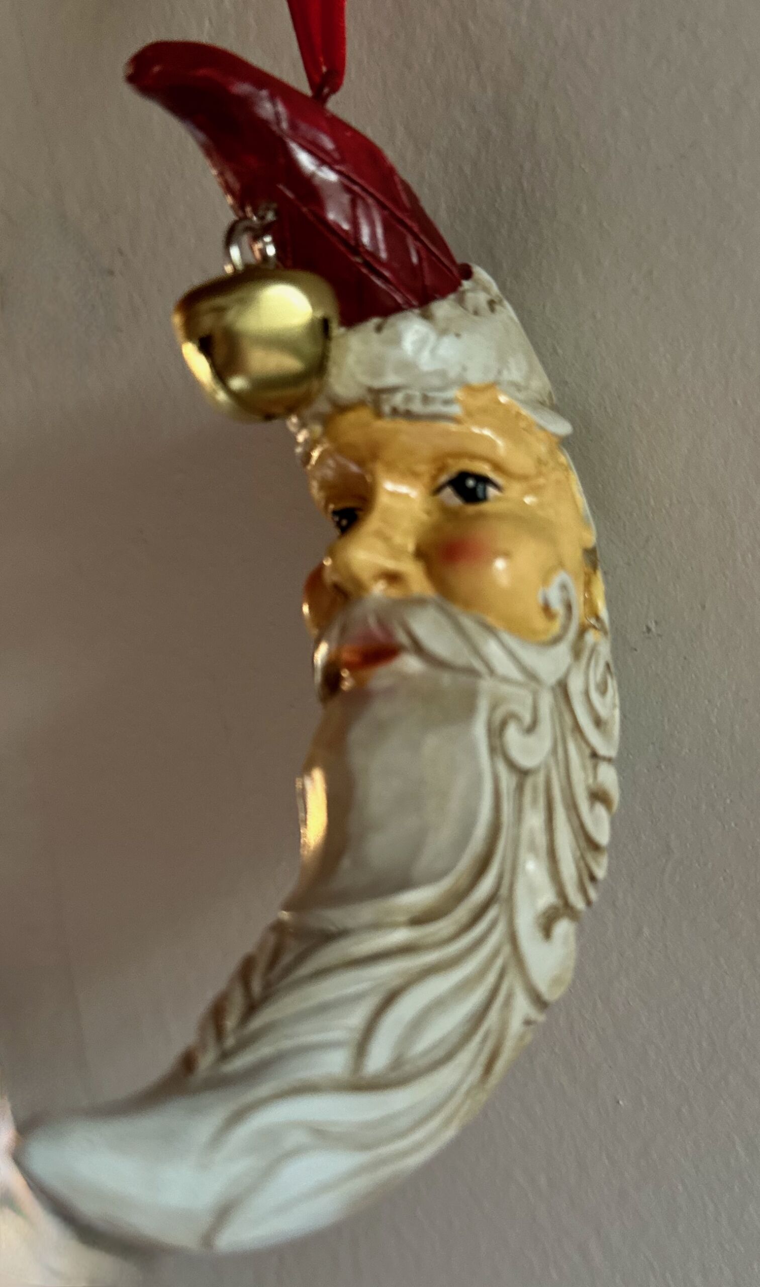 Beautiful resin Santa moon with windblown beard and jingle bell. 3.5″ from tip of hat to tip of beard.
