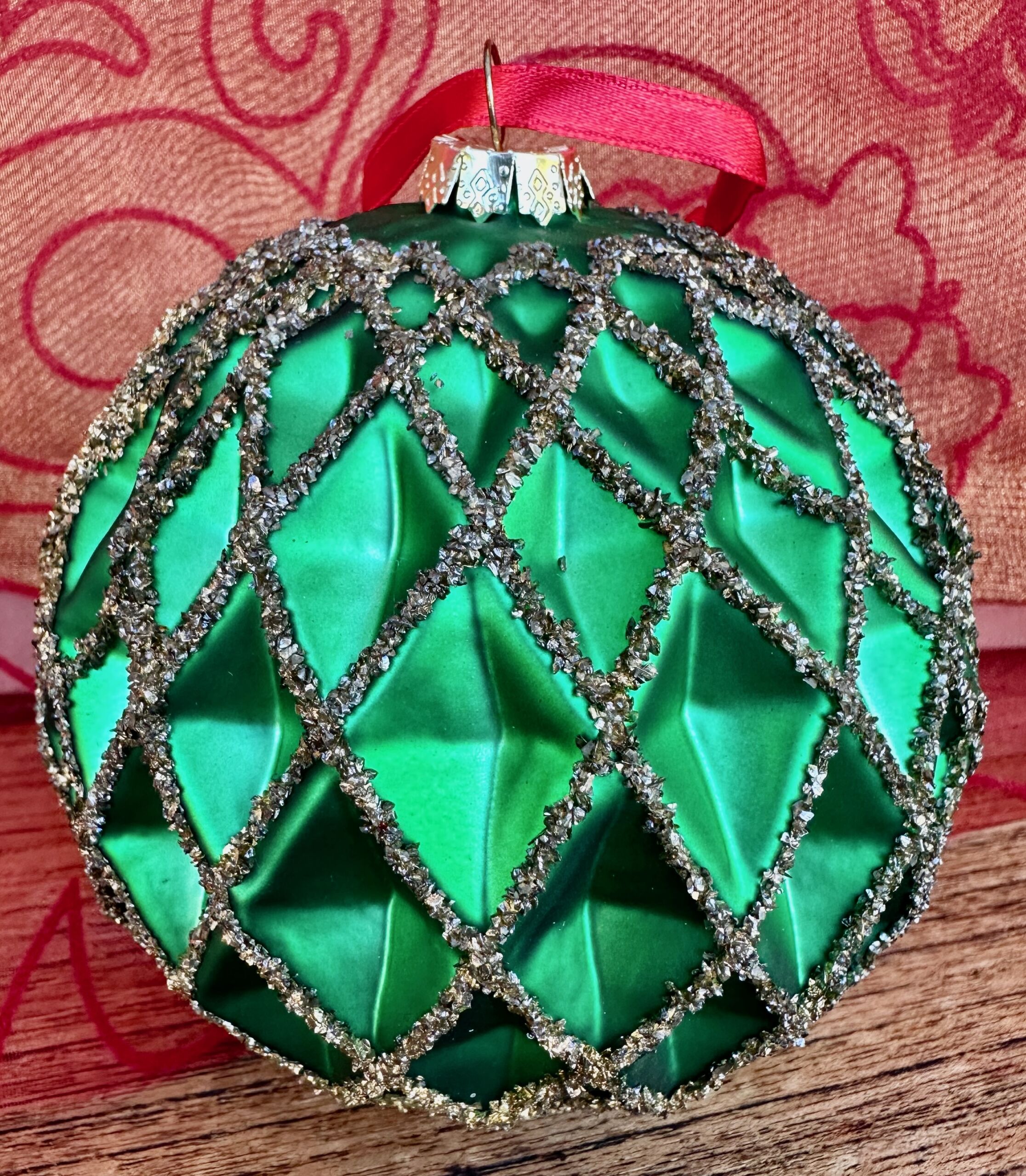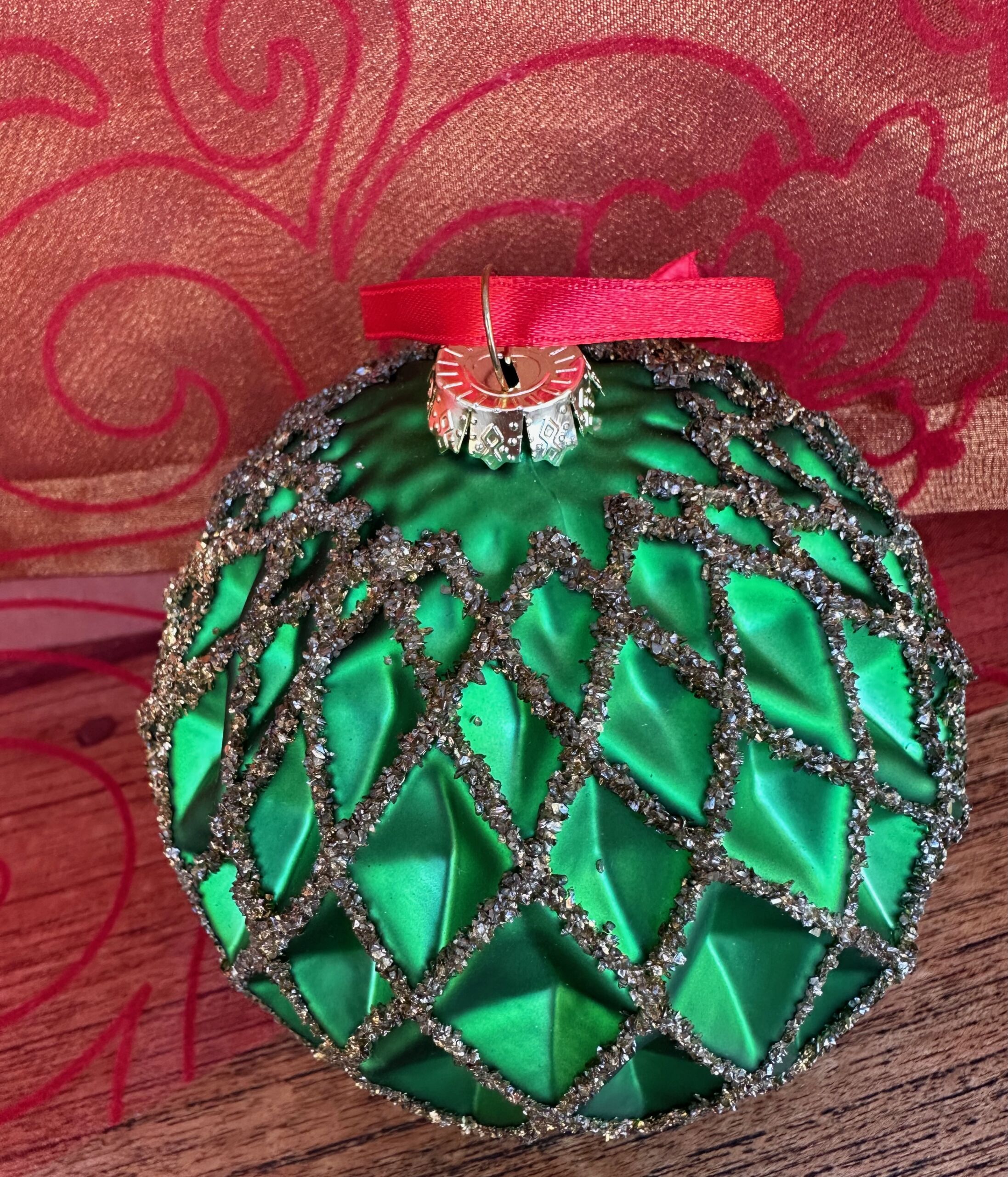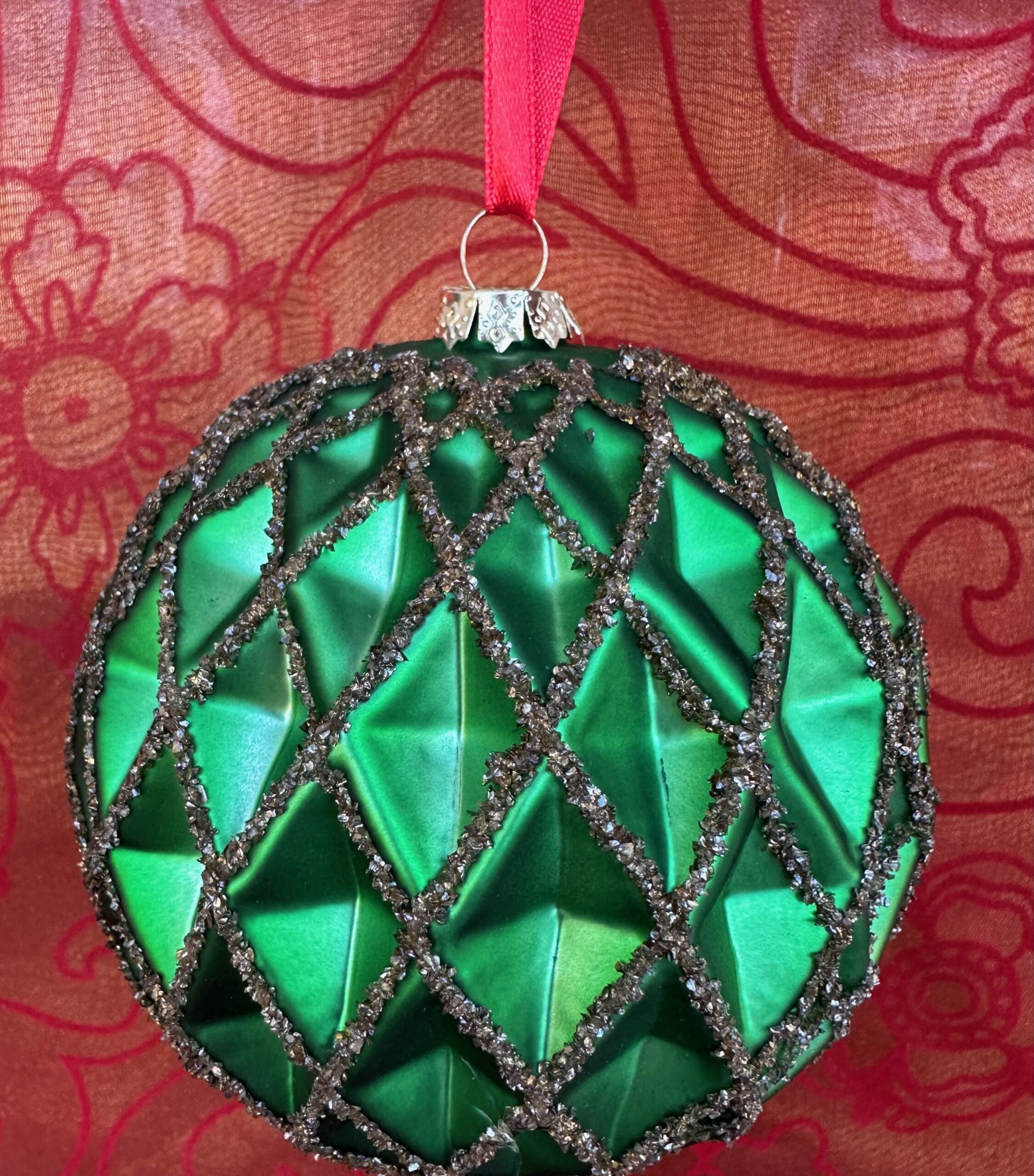 A big gorgeous shimmery ball. 4″ diameter. Shiny green wrapped in glittery silver. Very light.