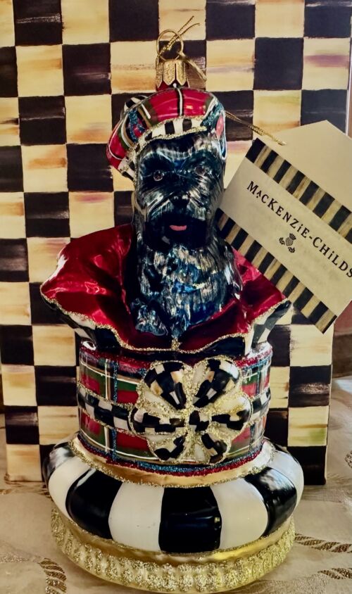 We love MacKenzie-Childs. This heirloom Scotty ornament with signature M-C charm is finely handcrafted, mouth-blown, and hand-painted in Poland by some of the world’s most talented glass artisans. Collectible to be passed down for ages. Light as a feather. Comes boxed. 7″ tall by 3.5 across its bottom tuffet. Truly original and rare. No longer sold on the M-C site. Brand new. Too much detail and too many glittery highlights to describe. Box is 8.5″ by 5.5″ by 5.5″.