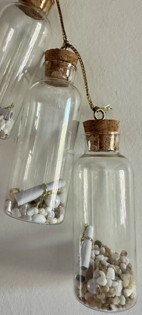 Some years my tree is all mermaids, fishies, octopi, jellyfish, shells, all kinds of sparkly sea life, and this year I can add a new ornament; a message in a bottle among stones and pearls. Total whimsy for your aquatic holiday. Three corked glass bottles each 3″ long by an inch around. I wonder what the scrolls say?