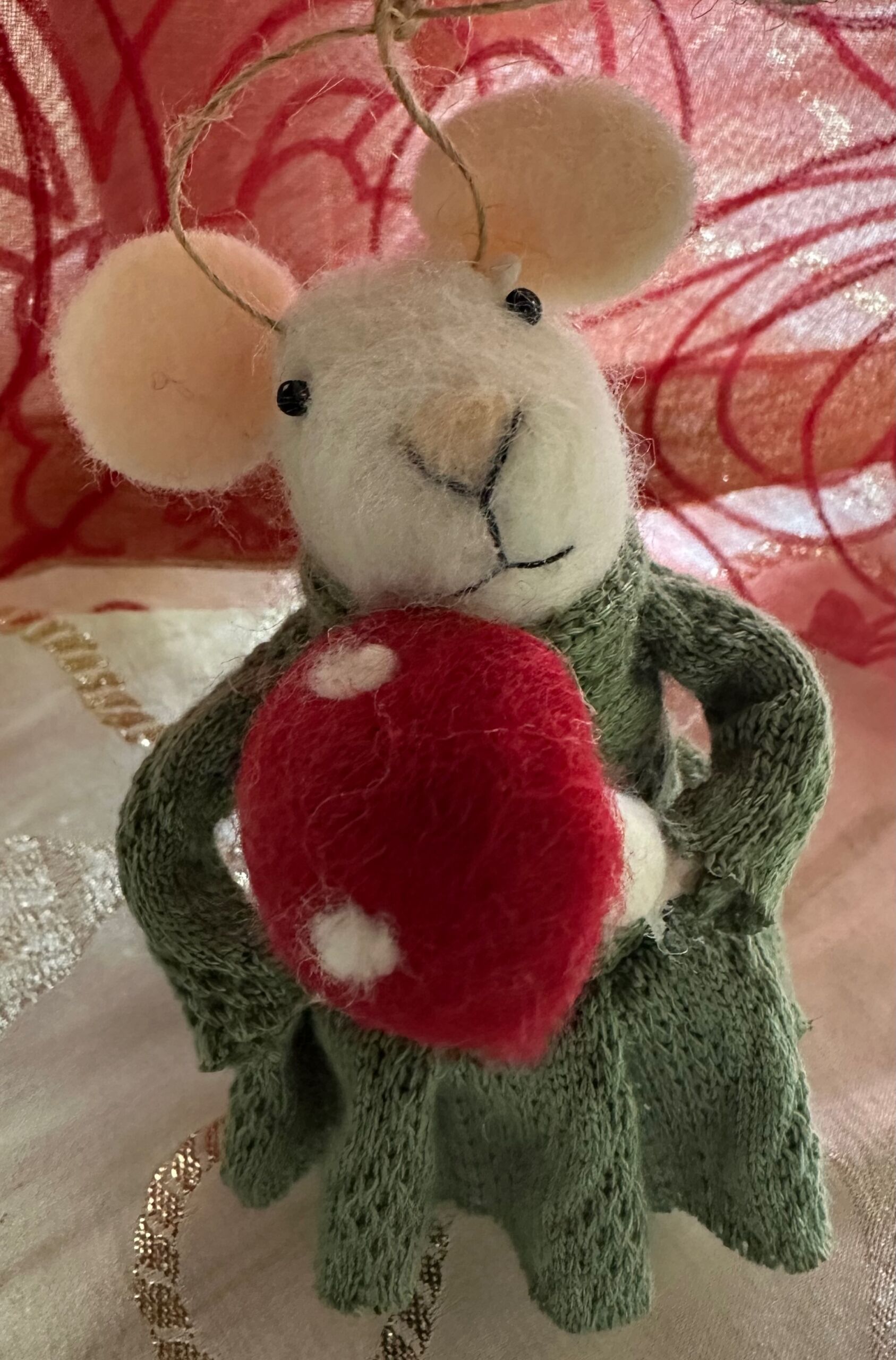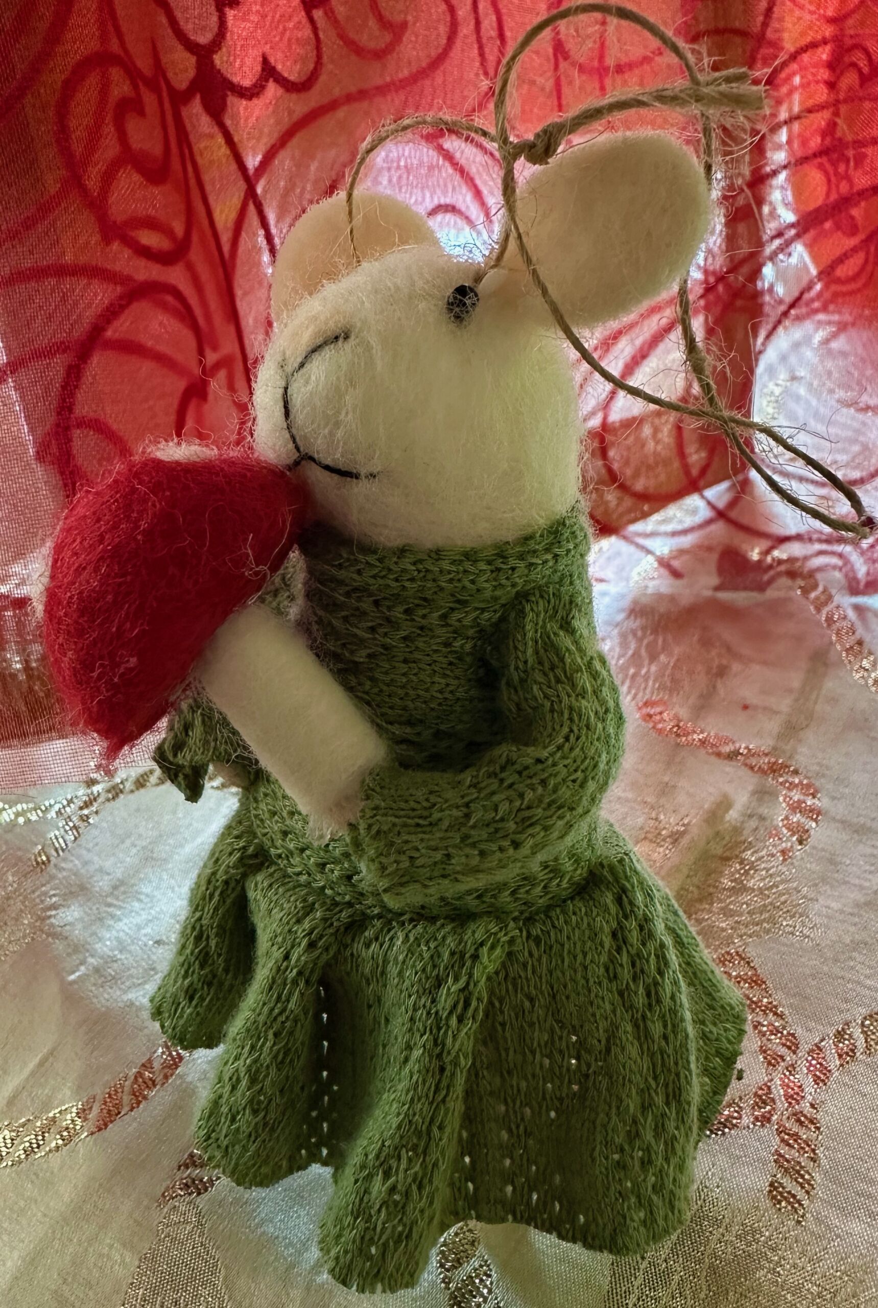 Little Miss Mousie in her lovely knitted olive dress, she holds a toadstool and can even stand on her own. 5″ tall ears to toes. Cottony soft and light as a feather. Her 3″ tail is behind her.