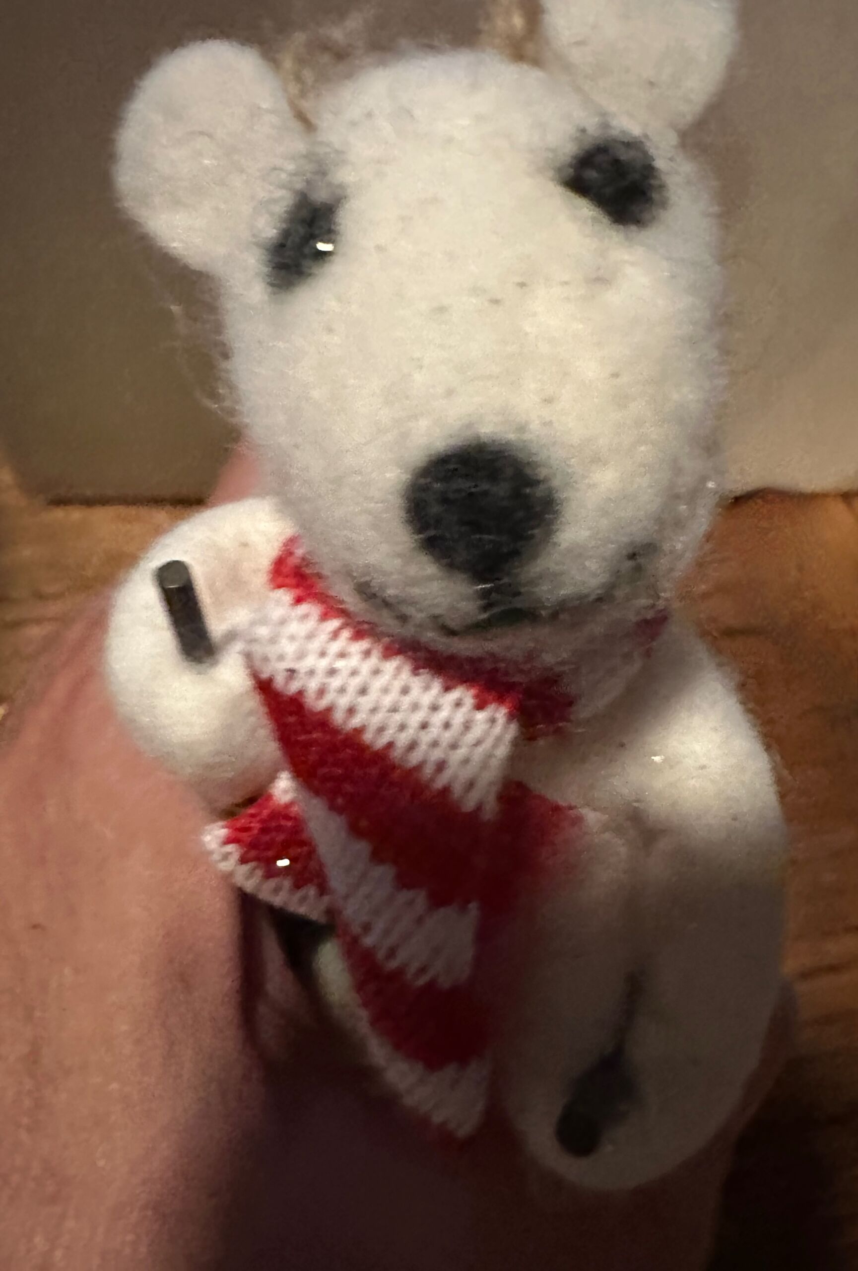 Adorable soft Polar Bear on skis with his knitted scarf flying behind him as he navigates with his ski poles. 5″ tall.