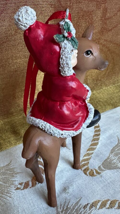 A girl and her deer. The little girl is all dressed for Christmas and the deer wears a jingle bell collar. 4.5″ tall.